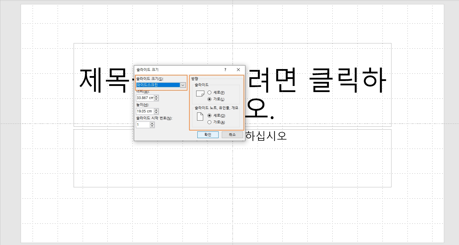 5) 슬라이드 크기 : 원하는 슬라이드 크기를 선택합니다.