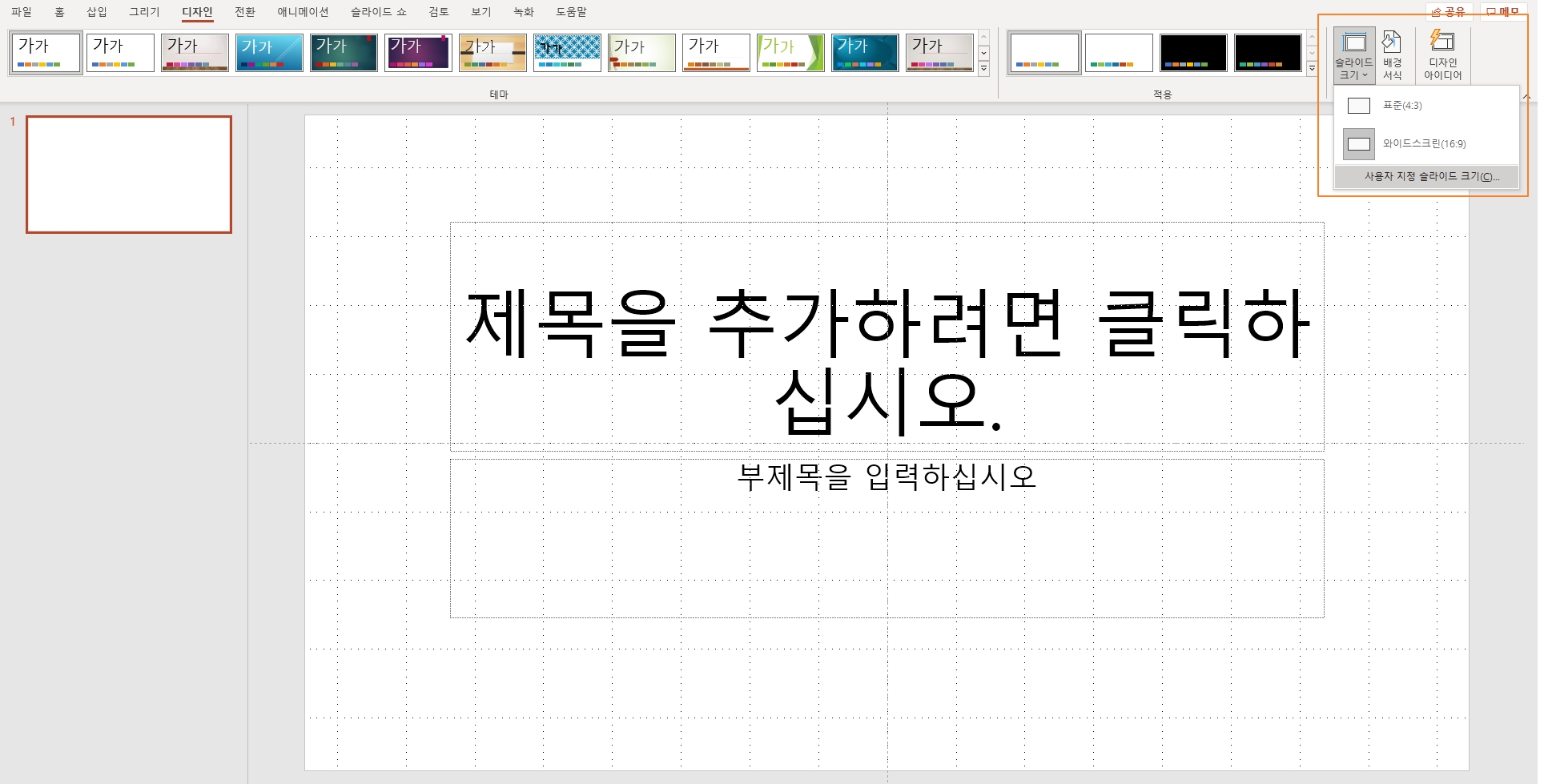 크기의 경우 파워포인트의 목적을 생각하고 선택해주시면 됩니다. 예를 들어, 발표용일 경우 모니터의 비율을 생각하시면 될 것 같습니다. 예전에는 4:3 비율의 모니터가 많아서 PPT도 4:3 비율로 많이 제작하는 편이었습니다. 요즘에는 대개 PPT를 띄우는 장비들이 16:9 비율로 나오기 때문에 거기에 맞추는 편입니다. (작업을 완료한 후 크기를 변경할 경우 여간 성가신 게 아닙니다.)