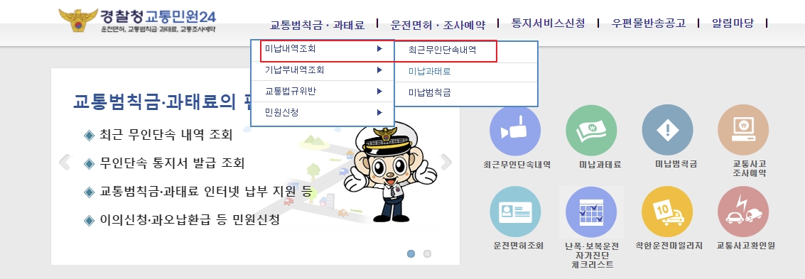 로그인까지 완료되면, 상단의 [교통범칙금/과태료] - [미납 내역 조회] - [최근 무인단속내역]을 차례로 확인하여 눌러줍니다.