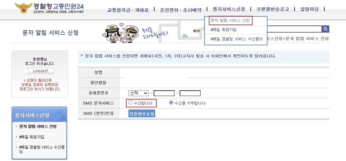 이파인 홈페이지에서 [통지서비스 신청]-[문자 알림 서비스 신청]을 눌러주세요. 그리고 이름과 생년월일, 휴대폰번호를 입력해주고 난 뒤 문자서비스를 [수신합니다]까지 체크합니다.