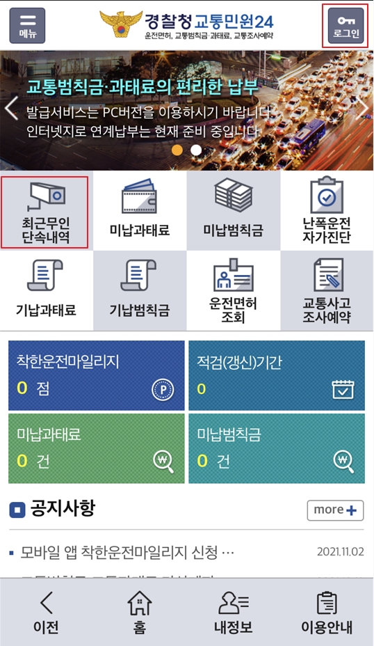 어플은 설치하면 위와 같이 화면이 뜨고, 동일하게 로그인 후 [최근무인단속내역]을 확인할 수 있습니다.