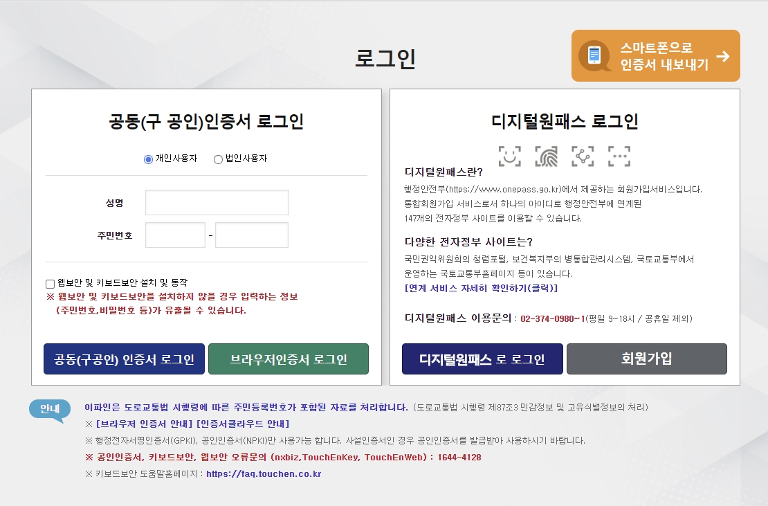 그다음 로그인을 진행해줍니다. 로그인은 공동 인증서 또는 디지털원패스 로그인으로 가능합니다. 저는 디지털원패스를 등록해두었기 때문에 해당 방법으로 로그인을 진행해주었습니다.