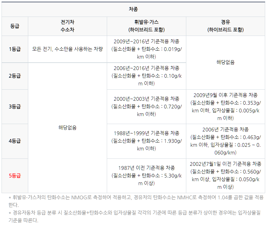 참고로, 전기차와 수소차는 1등급으로 분류되기 때문에 사실상 배출가스 등급제에 해당사항이 없습니다.
