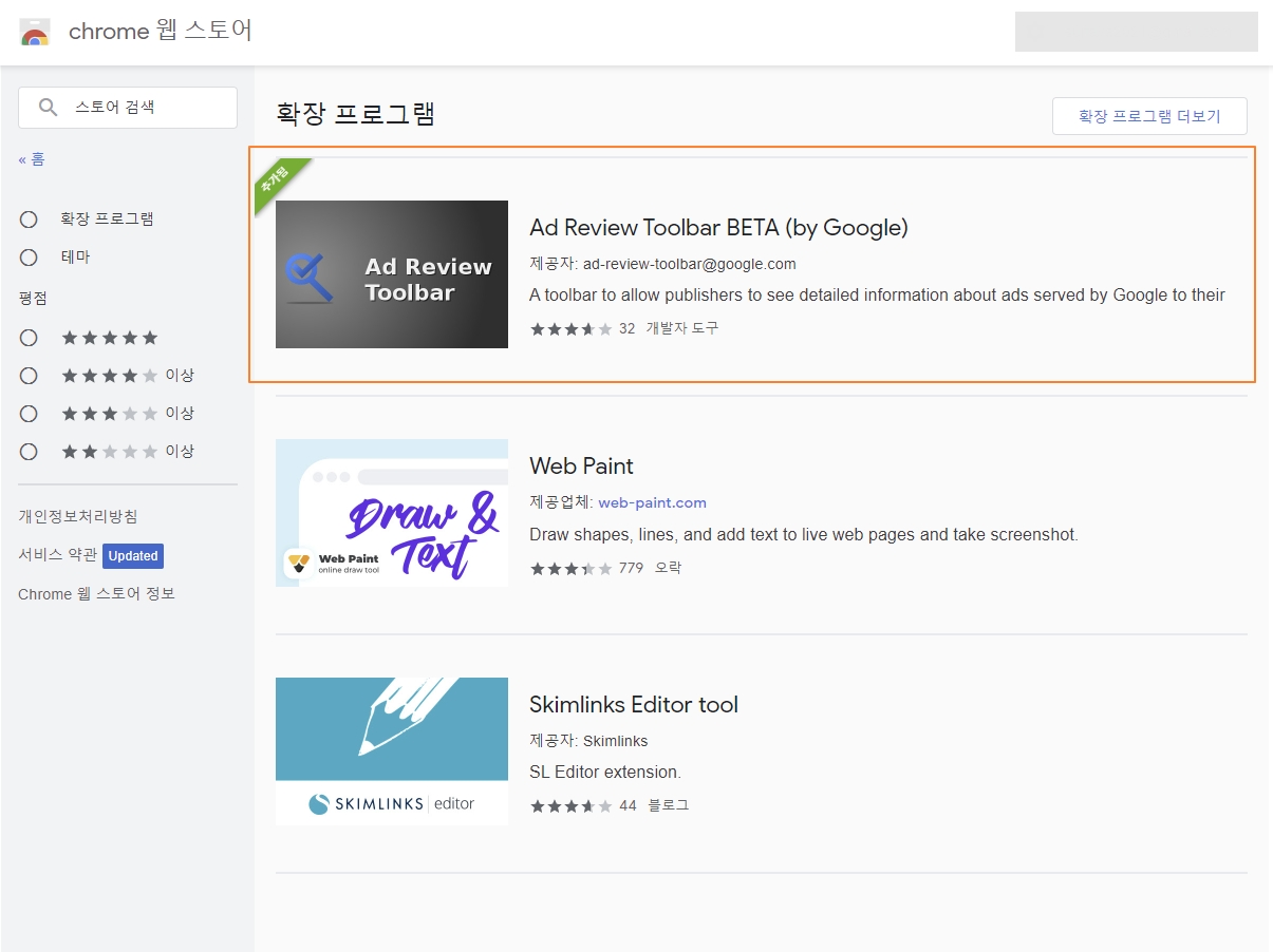 본인 사이트의 광고 게재 화면을 확인하고 싶지만, 클릭을 방지하고 싶을 때 이용할 수 있는 확장 프로그램을 알려드리고 합니다. 해당 확장프로그램은 본인 사이트 외 다른 사이트에 게재되어 있는 광고 클릭도 방지할 수 있습니다. 원래 광고 클릭을 방지하는 툴바로 가장 유명한 크롬 확장프로그램은 google publisher toolbar였습니다. 하지만, 구글 내부 정책에 따라 현재는 제공하지 않고 있습니다. 대체 프로그램으로 Ad Review Toolbar를 사용하시면 되는데요. 해당 프로그램은 베타 버전이지만 구글에서 제공하고 있습니다.