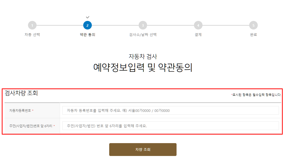 차종을 선택해주고 검사차량 조회가 가능하도록 자동차 등록번호와 주민등록번호 앞자리를 기입해줍니다. 그러고 나서 차량 조회 버튼을 눌러주면 됩니다.