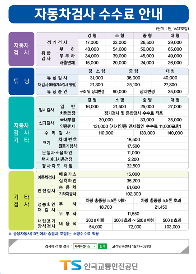 자동차 검사의 경우 한국교통안전공단에서 게시하고 있는 비용은 위와 같습니다. 하지만, 위 비용은 한국교통안전공단 기준 금액이며, 민간 검사소는 비용은 이와 상이할 수 있습니다. 검사소에 따라 비용을 공개하는 곳도 있으니, 주변에 추천을 받으시거나 가까운 곳을 알아보고 검사를 진행하시면 됩니다. 참고로, 검사 대행을 진행하는 곳도 있는데 이 경우에는 대행료가 붙어 더 비싼 비용을 지불할 수 있습니다.