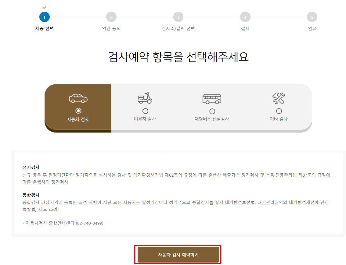 해당 메뉴의 [검사 차량 조회/예약] 탭을 눌러 접속해주시면, 차종 선택 - 약관 동의 - 검사소/날자 선택 - 결제 단계 화면으로 넘어갈 수 있습니다.