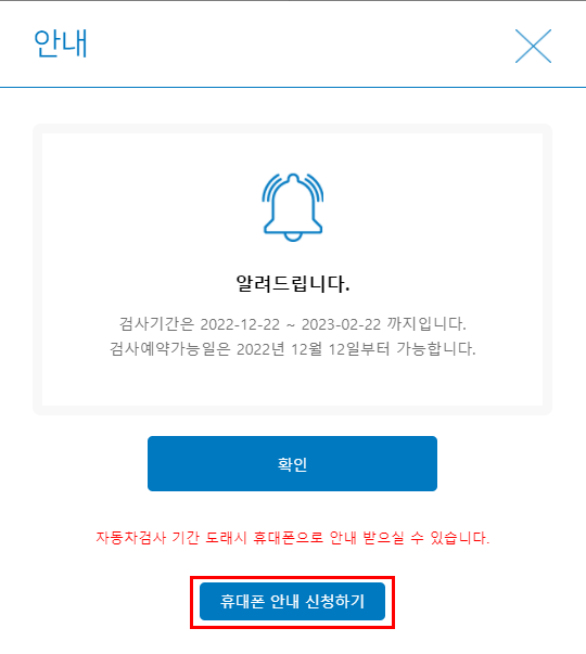 저의 경우 조회버튼을 눌러보니 아직 검사 기간이 넉넉히 남아, 다음 화면으로 넘어가지 않습니다. 자동차 검사를 12월에 해야 하는 것은 기억하고 있었는데 그게 작년이었나 봅니다. 내년 2022년 12월 12일부터 가능하다고 안내가 나와, 휴대폰 안내 신청하기 버튼을 눌러주었습니다.