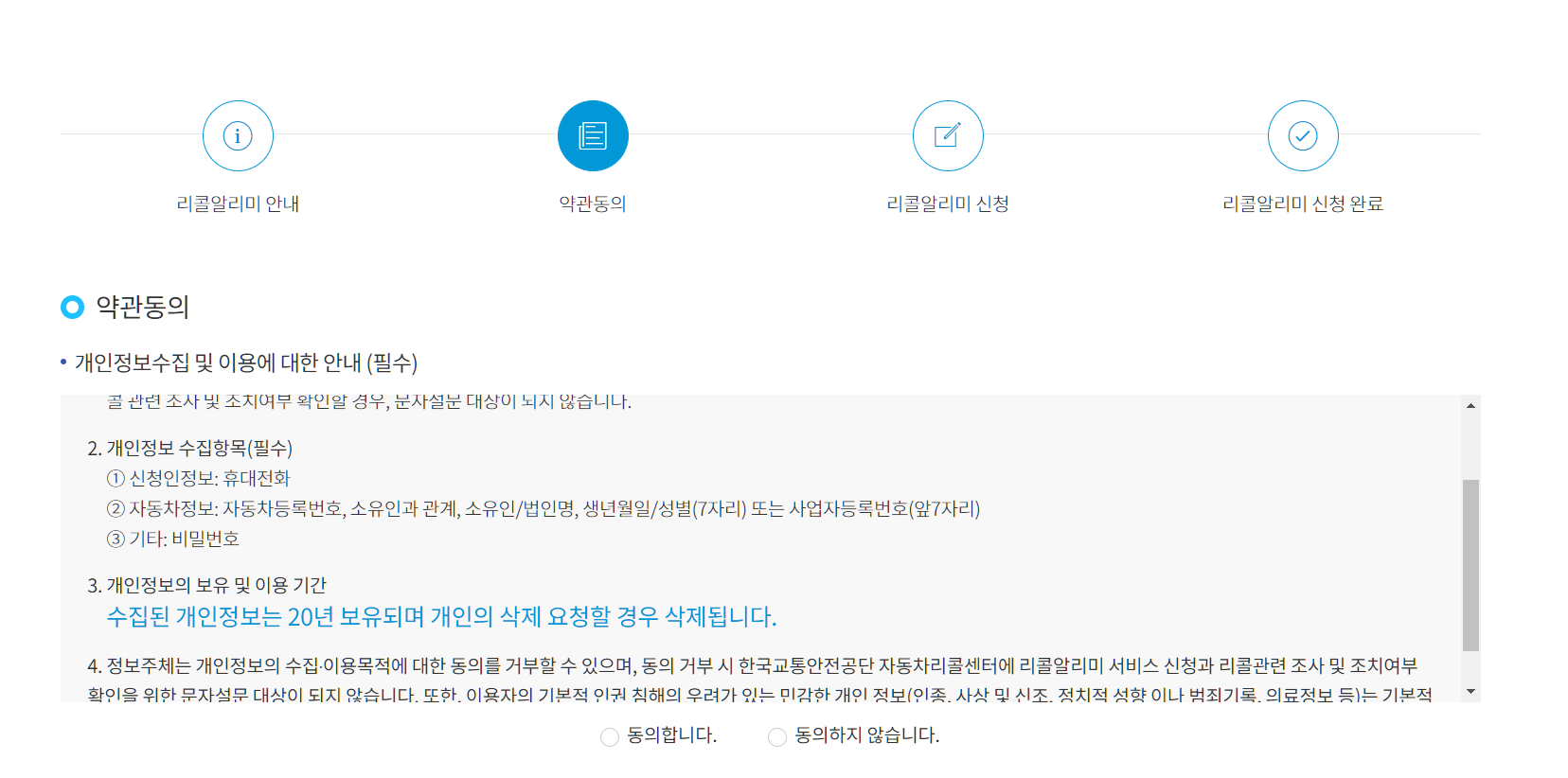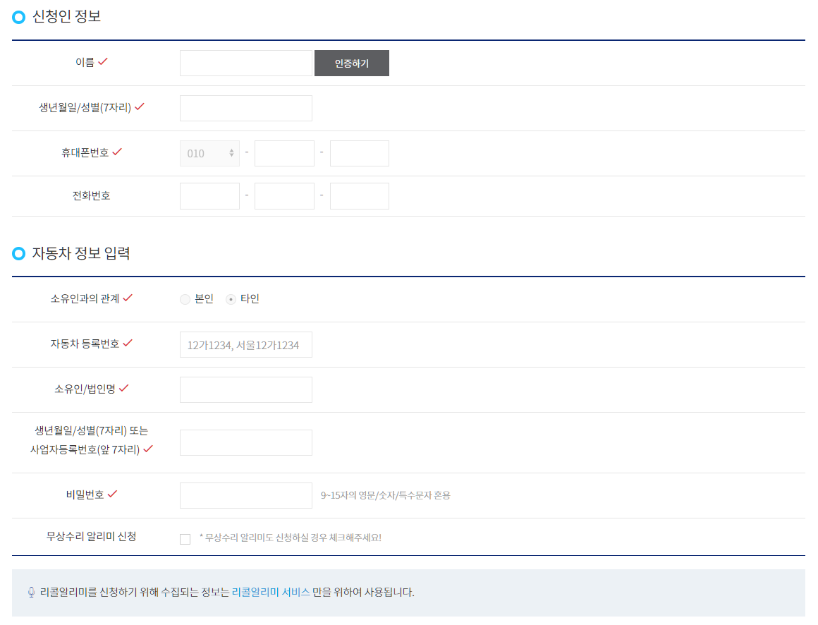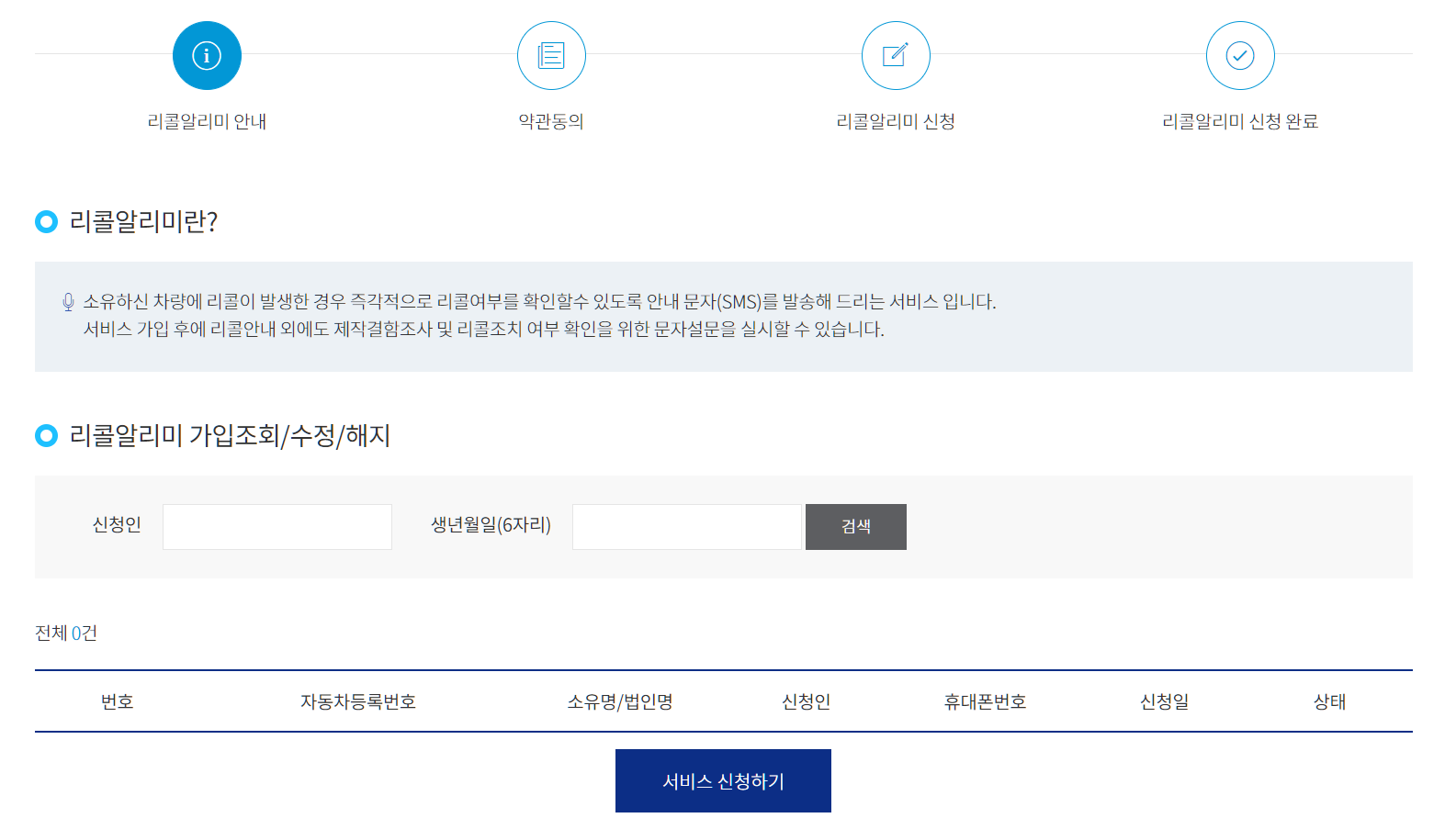 [리콜정보] - [리콜알리미]에 접속하면 위와 같이 알림 신청 화면이 뜹니다.