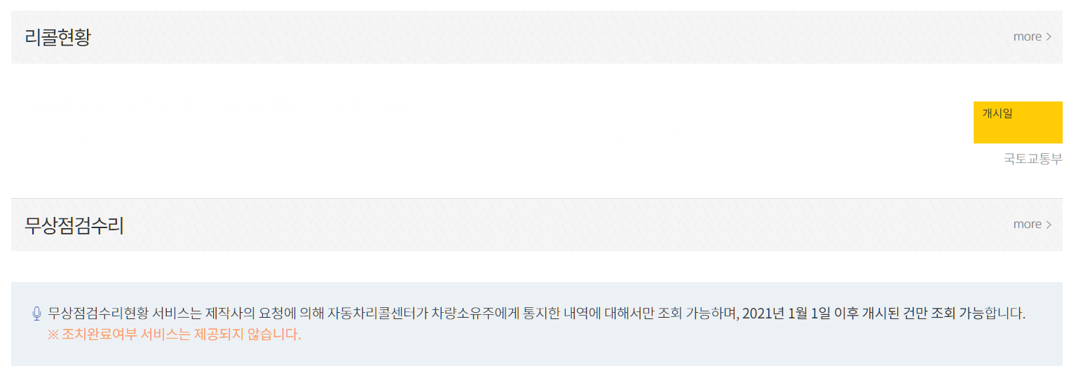 리콜현황과 무상점검 수리로 나뉘어져있는데, 리콜현황에 관련 게시글이 표시됩니다. 게시글의 게시일자와 제목, 간략한 내용이 표시되어 누구나 쉽게 확인할 수 있게 되어있습니다.
