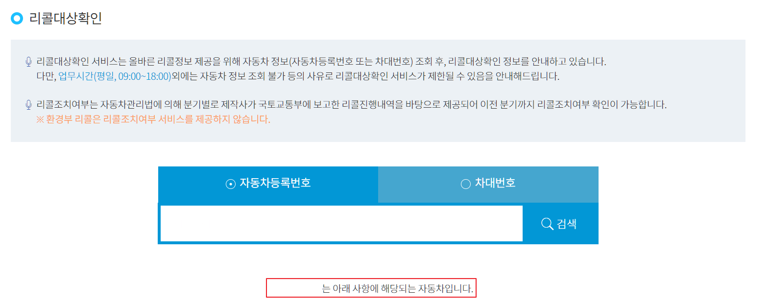 자동차 등록번호를 입력 후 검색 버튼을 눌러주세요. 저는 이 화면에서 실제 조회되는 모습이 궁금했는데요. 지인의 힘을 빌려 리콜 조치가 내려졌던 차량의 자동차 등록번호를 입력해 검색해보았습니다.
