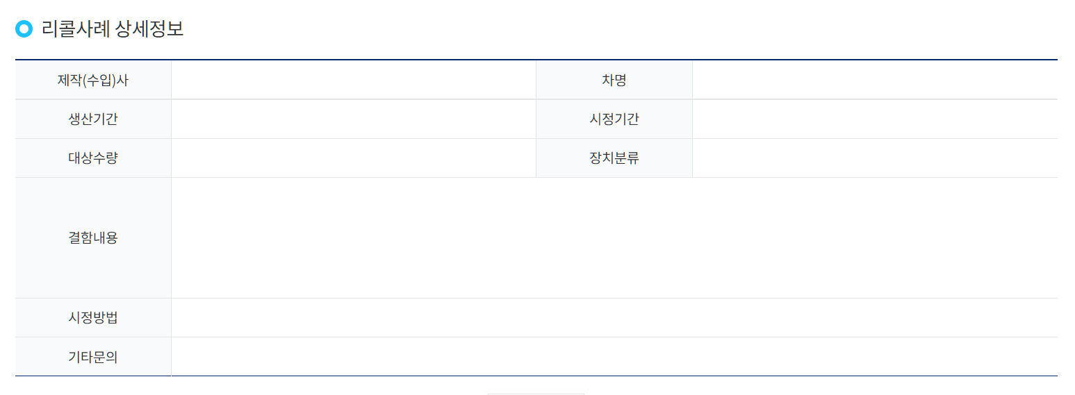 리콜 사례에 관한 상세정보를 알 수 있는데요. 제작(수입)사부터 차명, 생산기간, 시정기간, 대상수량, 그리고 어떤 결함이 있어 어떻게 시정할 수 있는지까지 모두 확인할 수 있습니다.