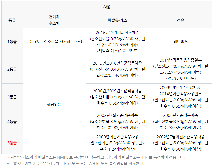 참고로, 전기차와 수소차는 1등급으로 분류되기 때문에 사실상 배출가스 등급제에 해당사항이 없습니다.