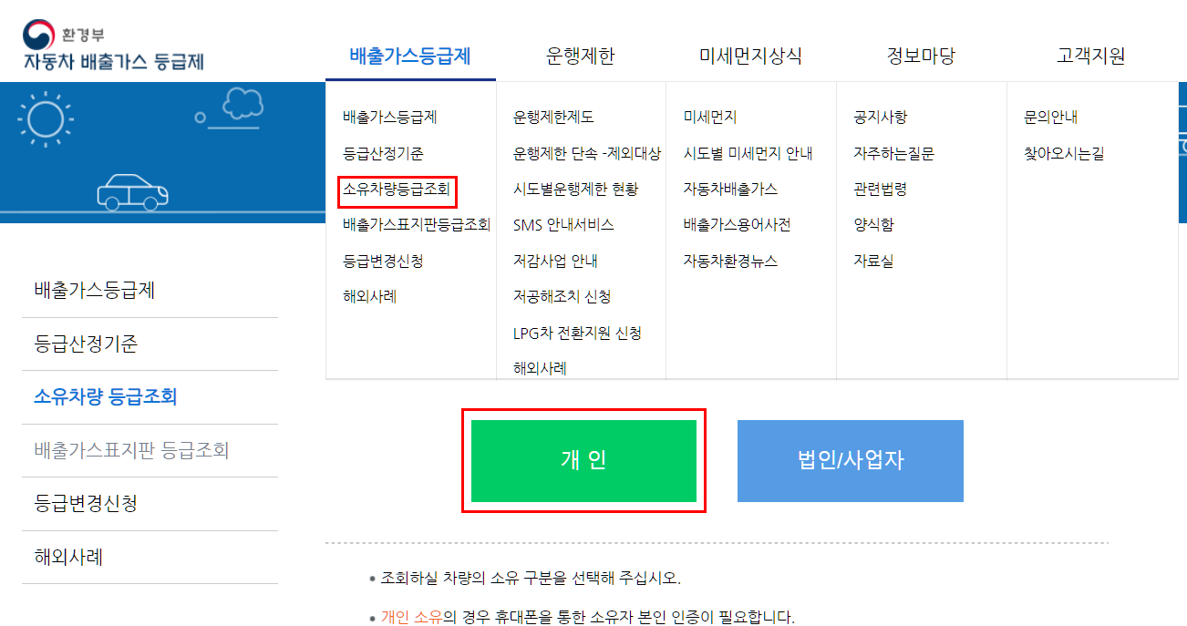 홈페이지 접속 후 배출가스 등급제 클릭, [소유 차량 등급 조회] 메뉴를 들어가 주세요. 그러면 개인과 법인 및 사업자 구분 버튼이 나오게 됩니다. 조회하길 원하는 차량의 소유 구분을 선택하면 되는데, 개인 차량 조회를 원하므로 [개인] 버튼을 눌러 휴대폰 인증을 진행해주시면 됩니다.