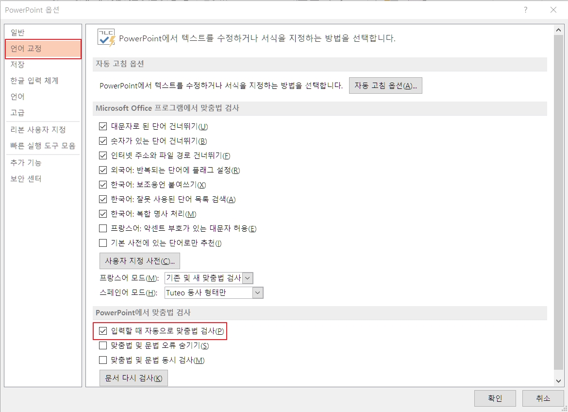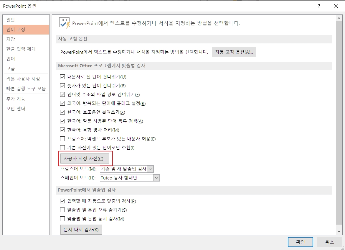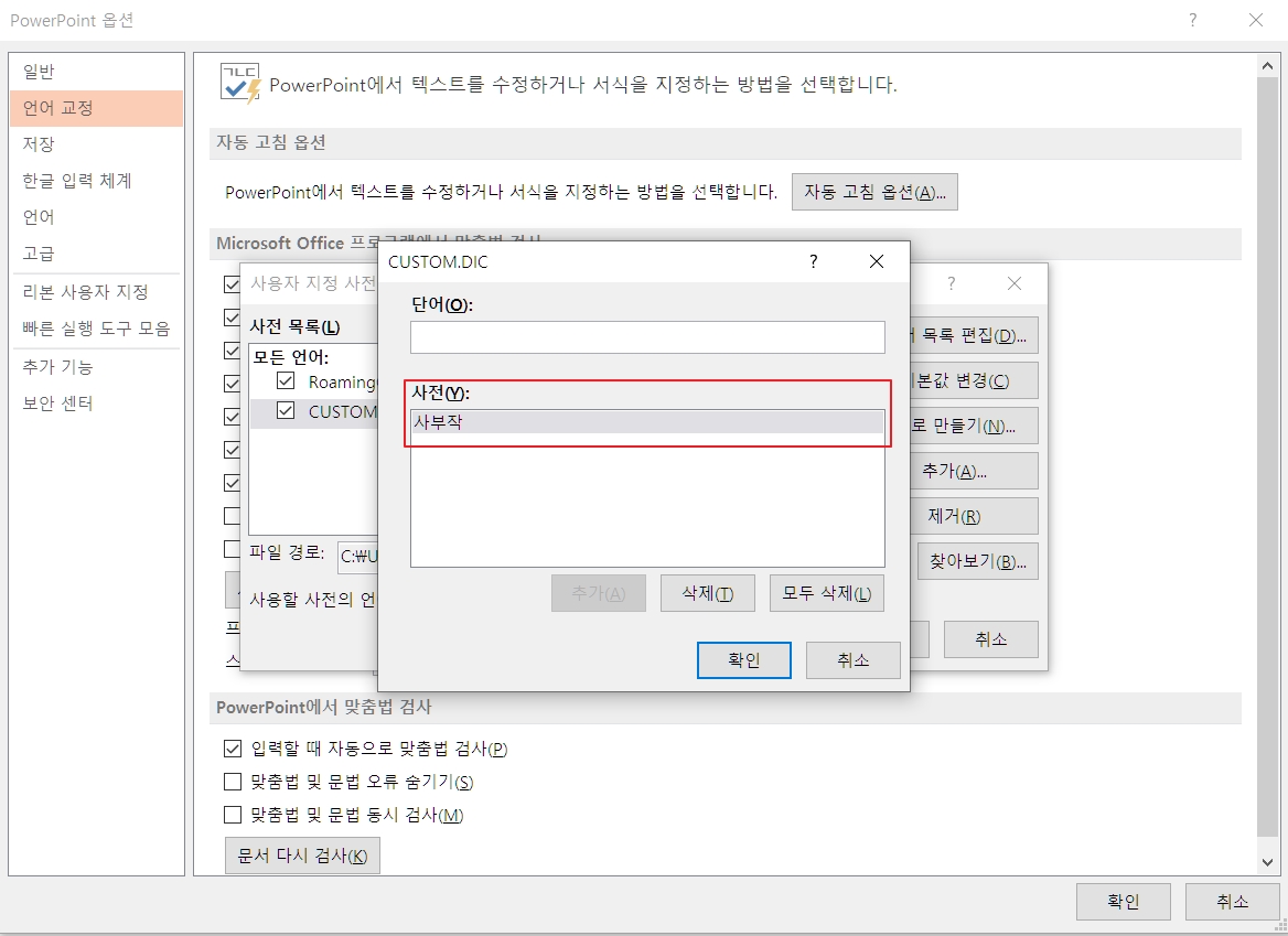 PPT 맞춤법 검사 전체 해지하기