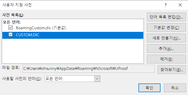 하지만, '특정 단어'만 제외시키고 싶을 때도 있습니다. 예를 들어, 사람 이름이나 기관명 등 고유명사를 계속해서 사용해야할 때 빨간색 밑줄로 표시되면 거슬릴 수 있겠죠?